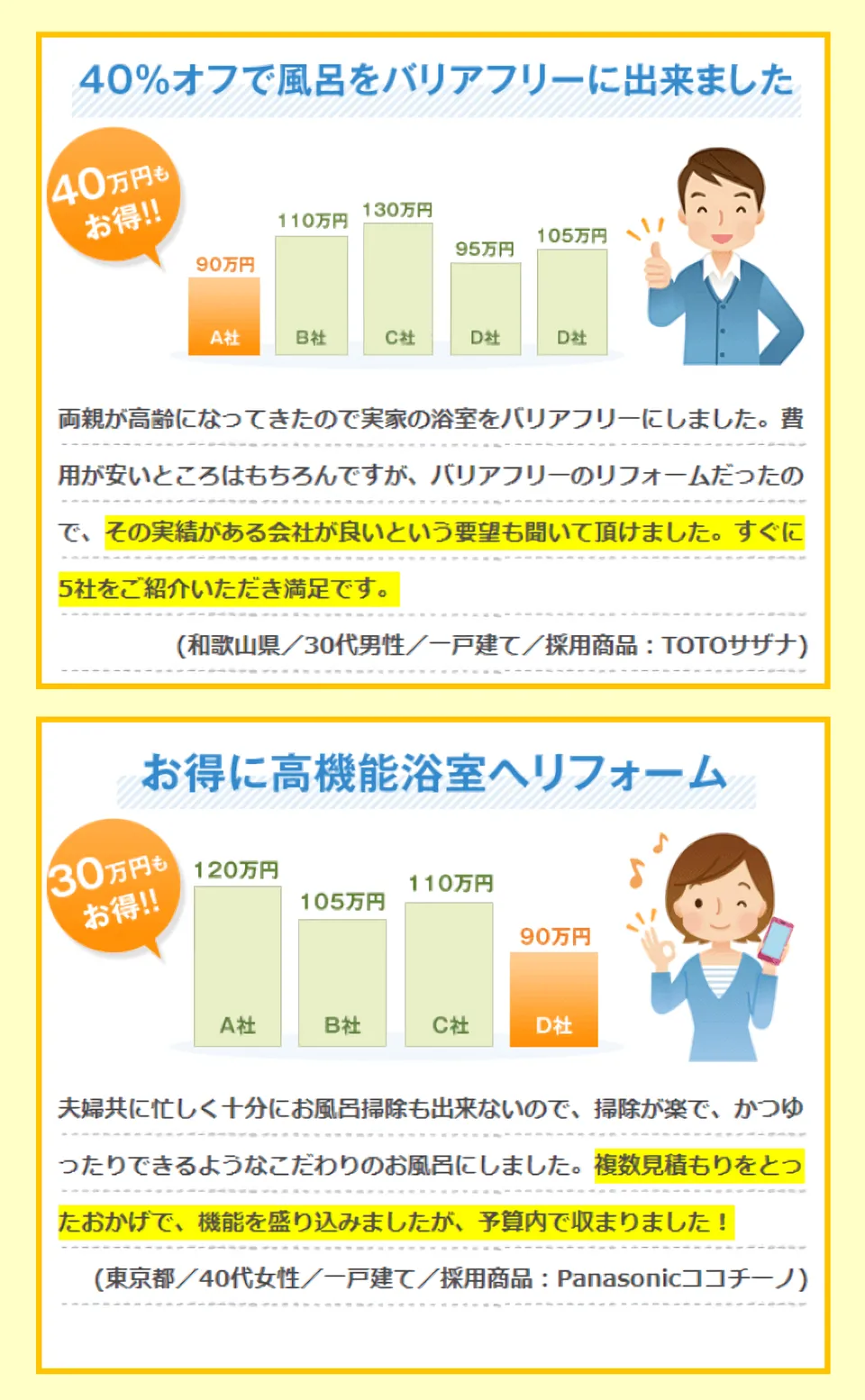 比較検討することで、同じ工事内容でも安くお風呂リフォームができたようです。